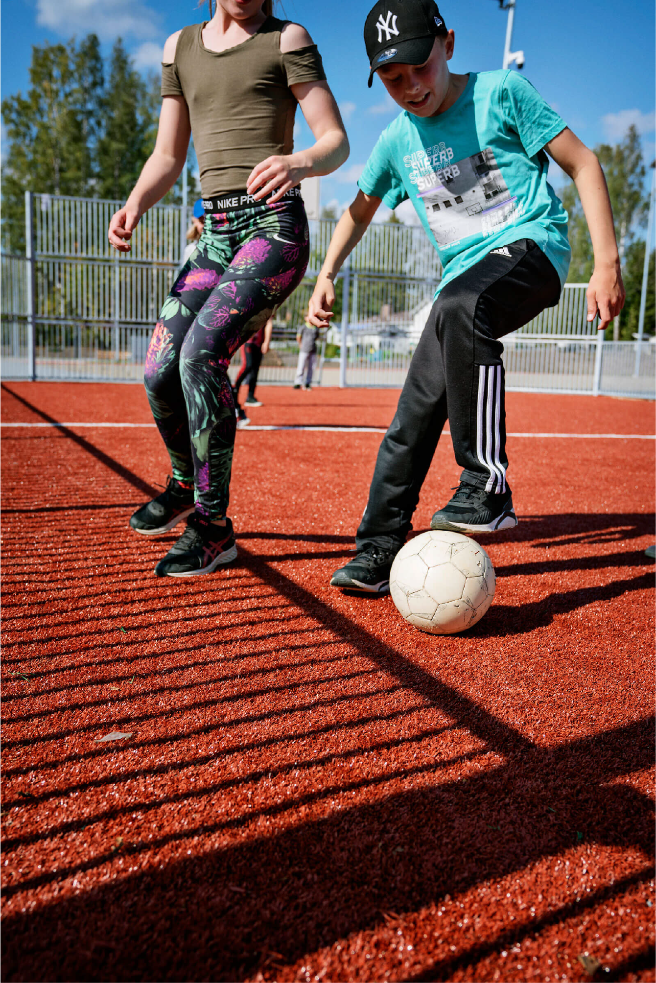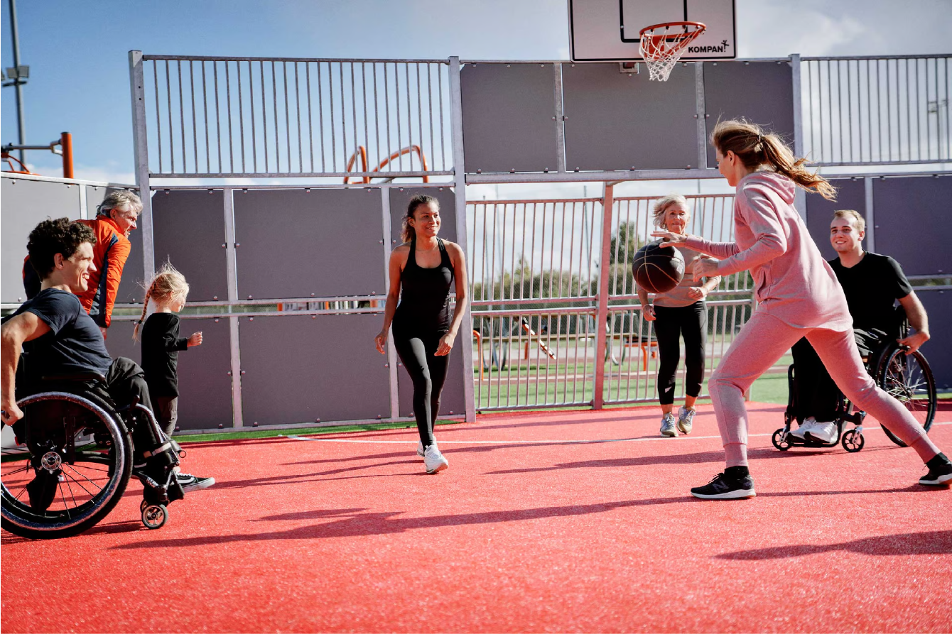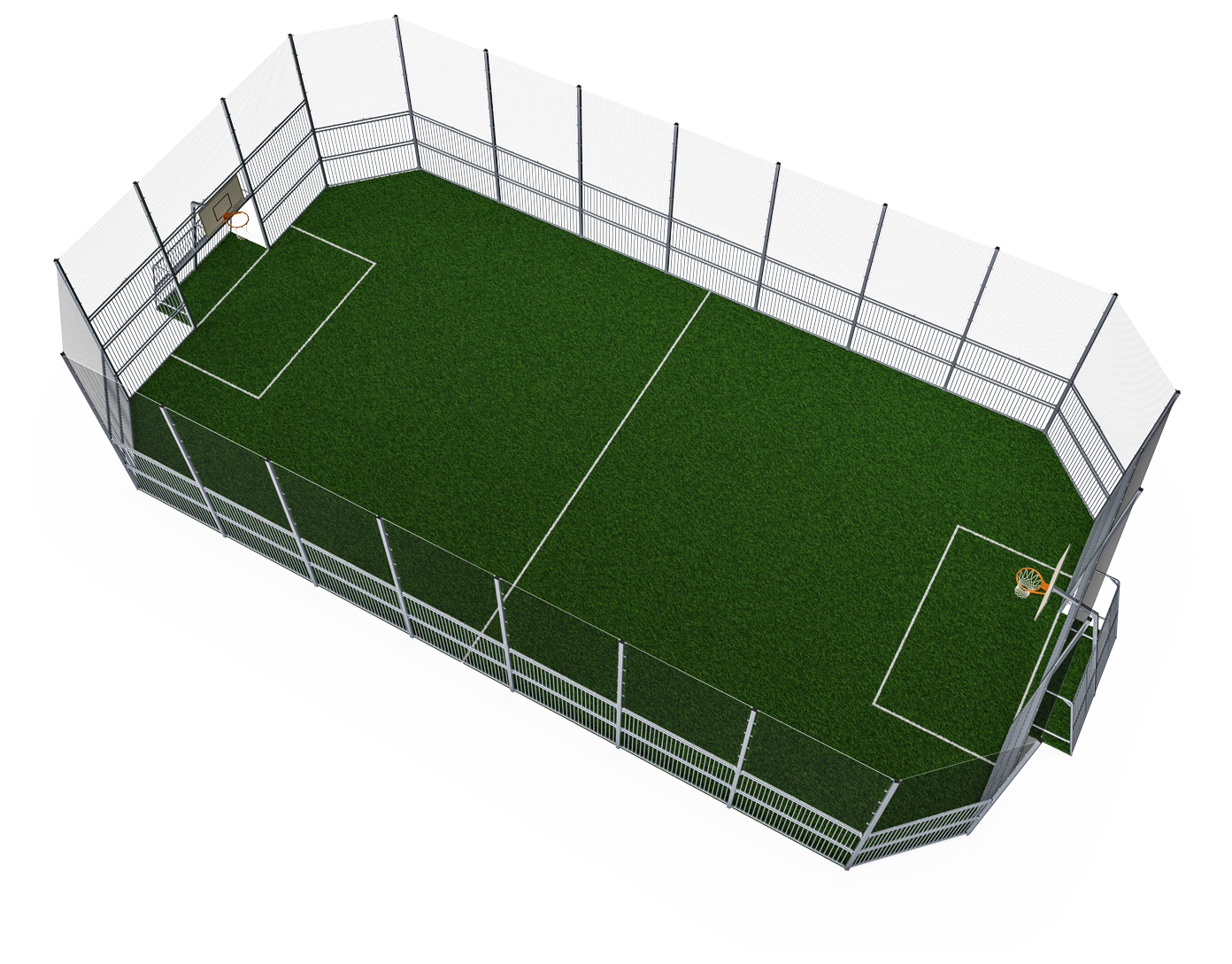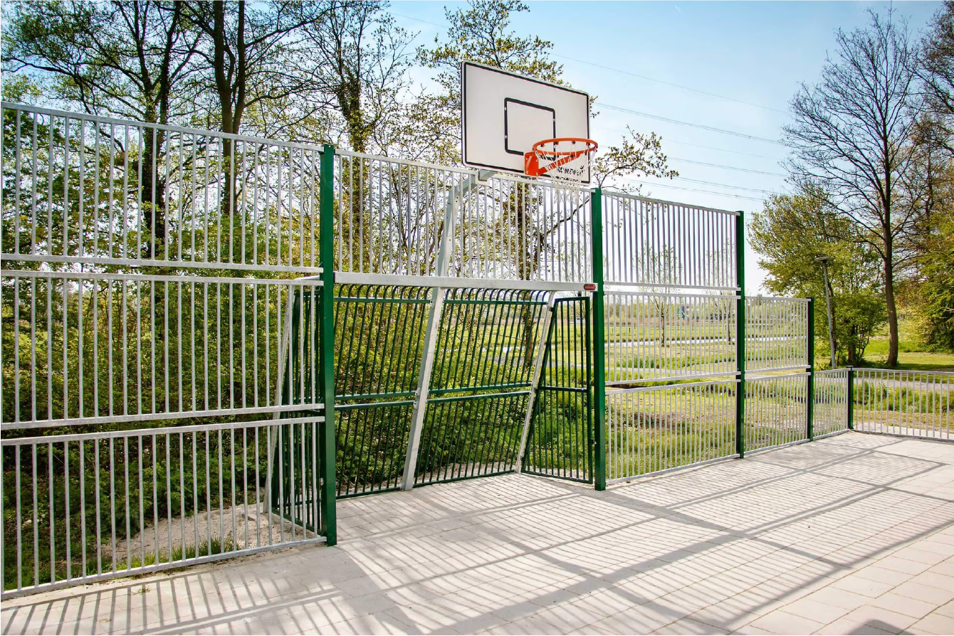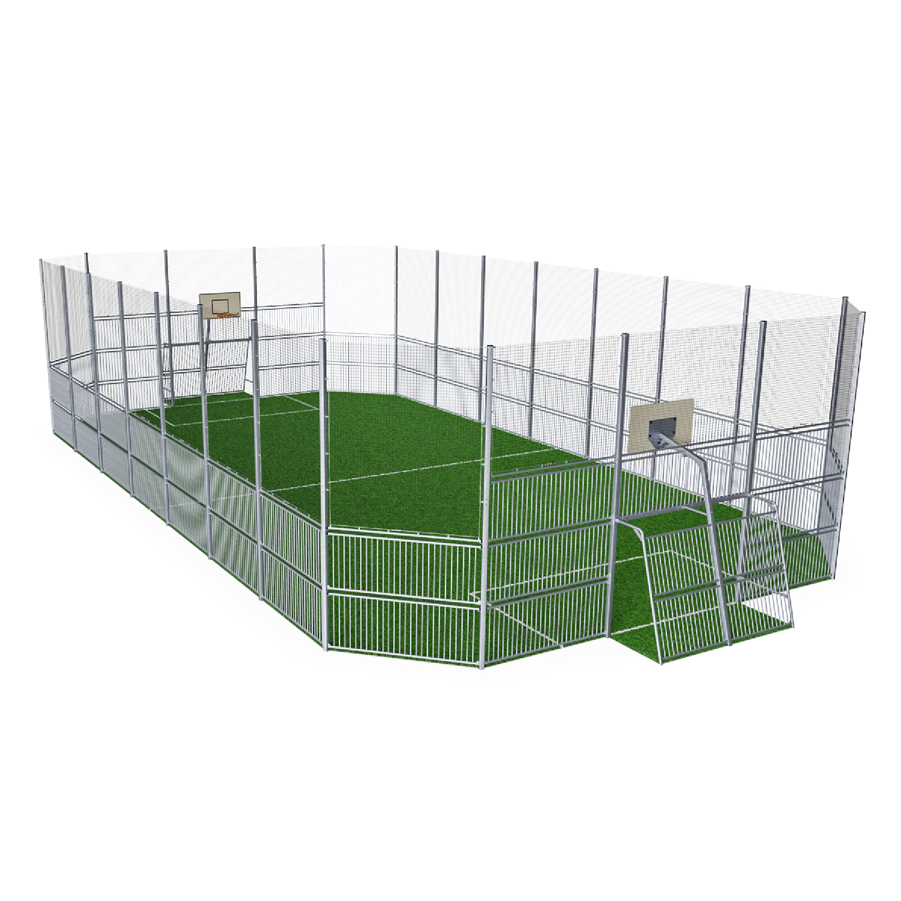 La distancia entre los tubos verticales es lo suficientemente pequeña como para que los balones pequeños, como los de hockey sobre hierba, queden siempre dentro del campo. Al incrustar los tubos en el marco de acero hemos creado una estructura extremadamente a prueba de vandalismo que puede colocarse en cualquier comunidad. Este diseño transparente facilita el seguimiento del juego a los espectadores.