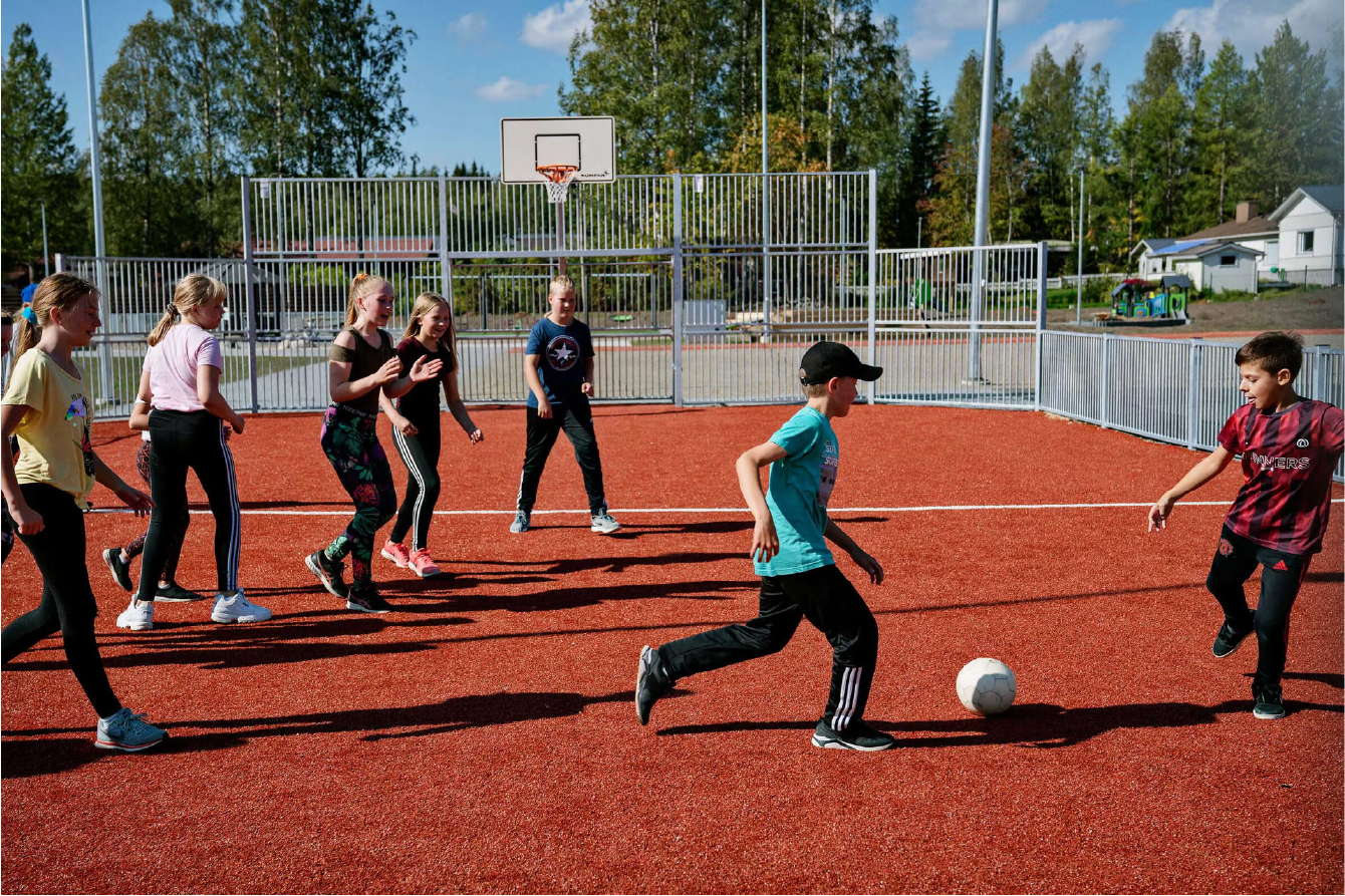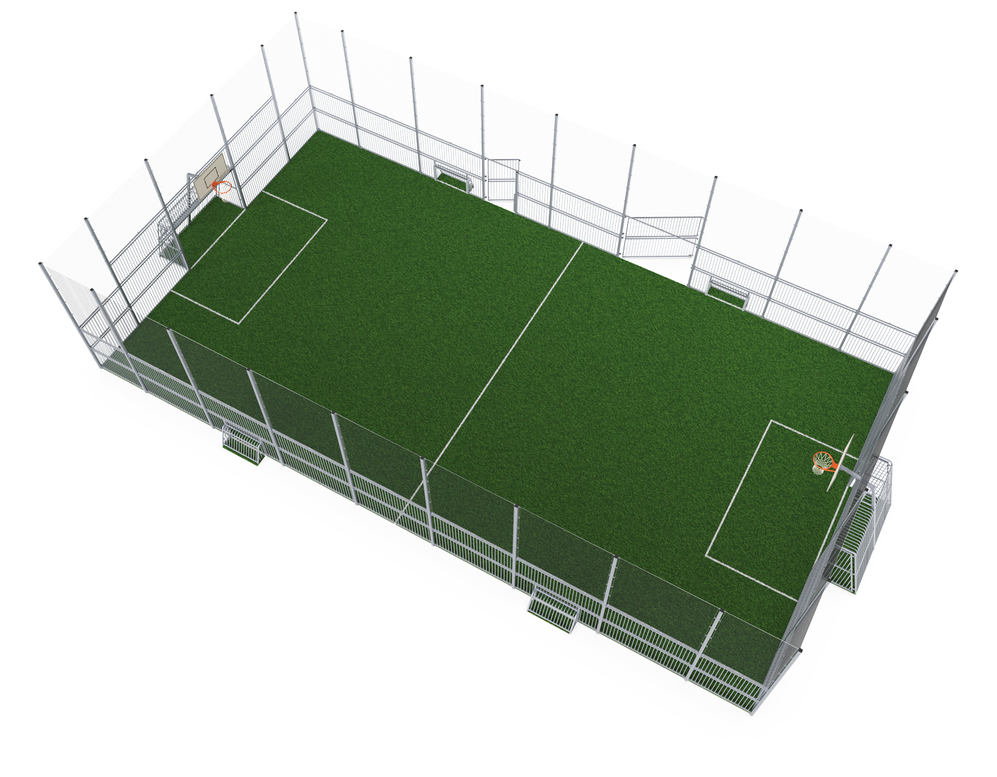 La distancia entre los tubos verticales es lo suficientemente pequeña como para mantener las pelotas pequeñas, como las de hockey sobre césped, dentro del campo en todo momento. Al incrustar los tubos en el marco de acero hemos creado una estructura extremadamente a prueba de vandalismo que puede colocarse en cualquier comunidad. Este diseño transparente facilita el seguimiento del juego a los espectadores.