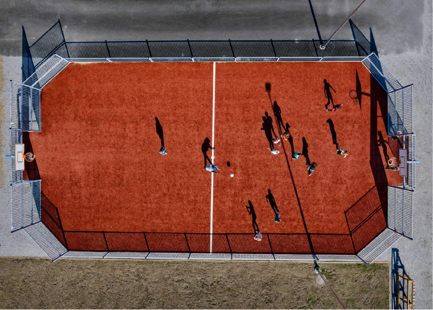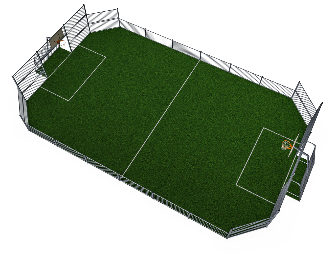 La distancia entre los tubos verticales es lo suficientemente pequeña como para mantener las pelotas pequeñas, como las de hockey sobre hierba, dentro del campo en todo momento. Al incrustar los tubos en el marco de acero hemos creado una estructura extremadamente a prueba de vandalismo que puede colocarse en cualquier comunidad. Este diseño transparente facilita el seguimiento del juego a los espectadores.