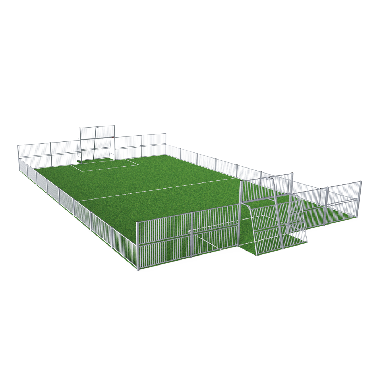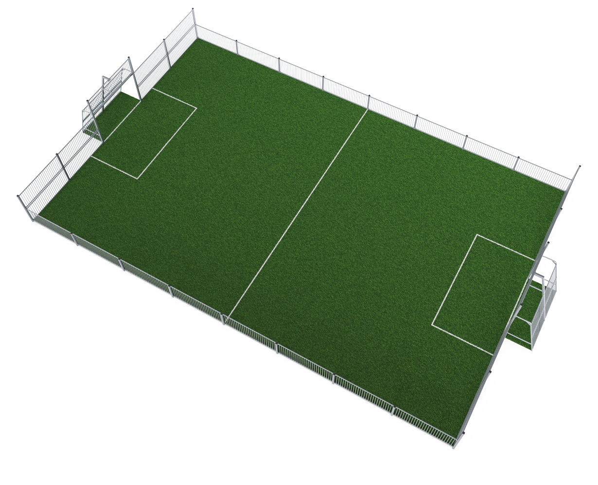 La distancia entre los tubos verticales es lo suficientemente pequeña como para mantener las pelotas pequeñas, como las de hockey sobre hierba, dentro del campo en todo momento. Al incrustar los tubos en el marco de acero hemos creado una estructura extremadamente a prueba de vandalismo que puede colocarse en cualquier comunidad. Este diseño transparente facilita el seguimiento del juego a los espectadores.
