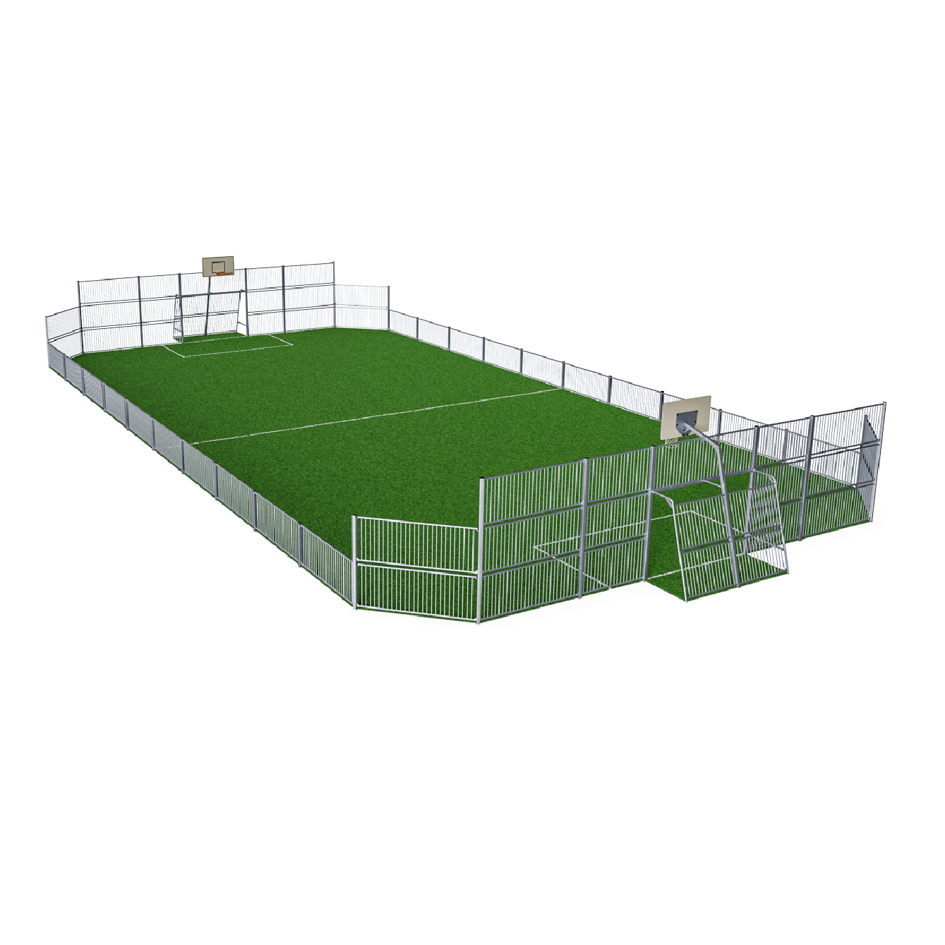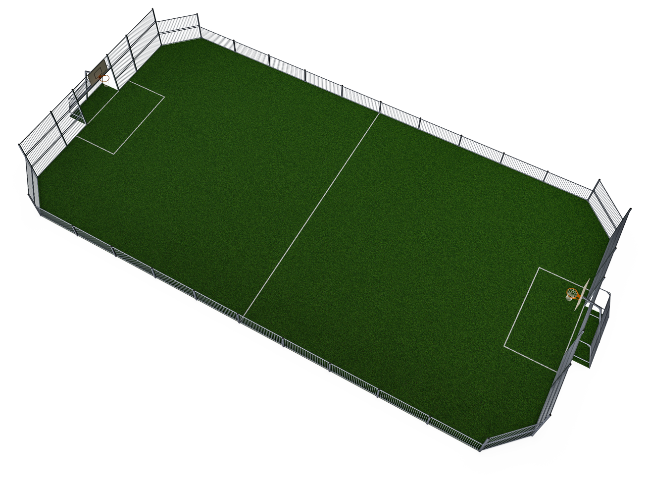 La distancia entre los tubos verticales es lo suficientemente pequeña como para mantener las pelotas pequeñas, como las de hockey sobre hierba, dentro del campo en todo momento. Al incrustar los tubos en el marco de acero hemos creado una estructura extremadamente a prueba de vandalismo que puede colocarse en cualquier comunidad. Este diseño transparente facilita el seguimiento del juego a los espectadores.