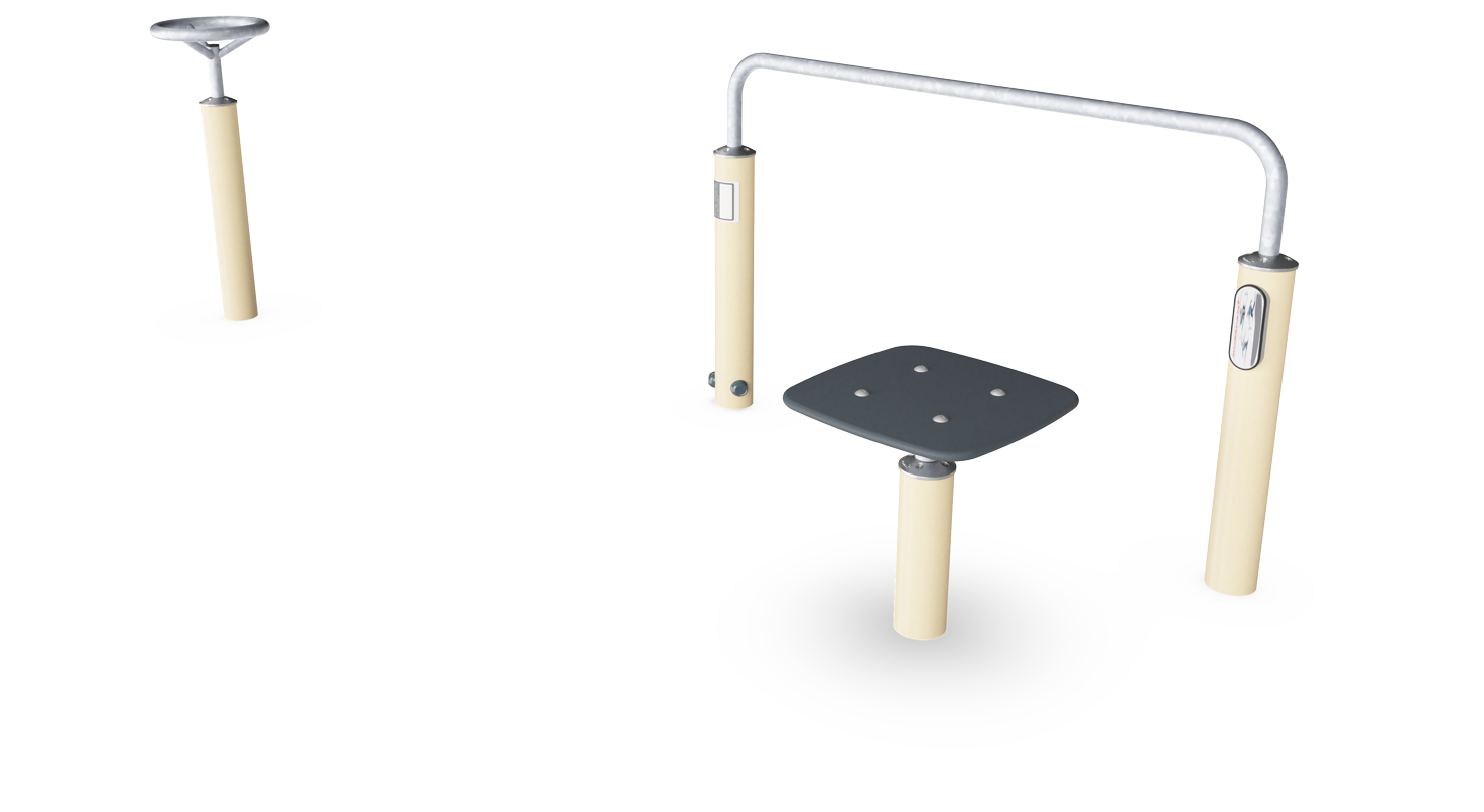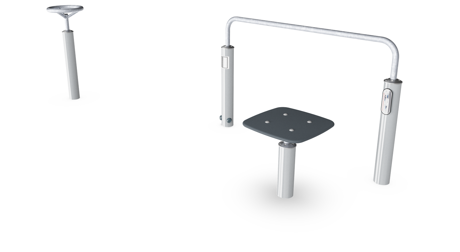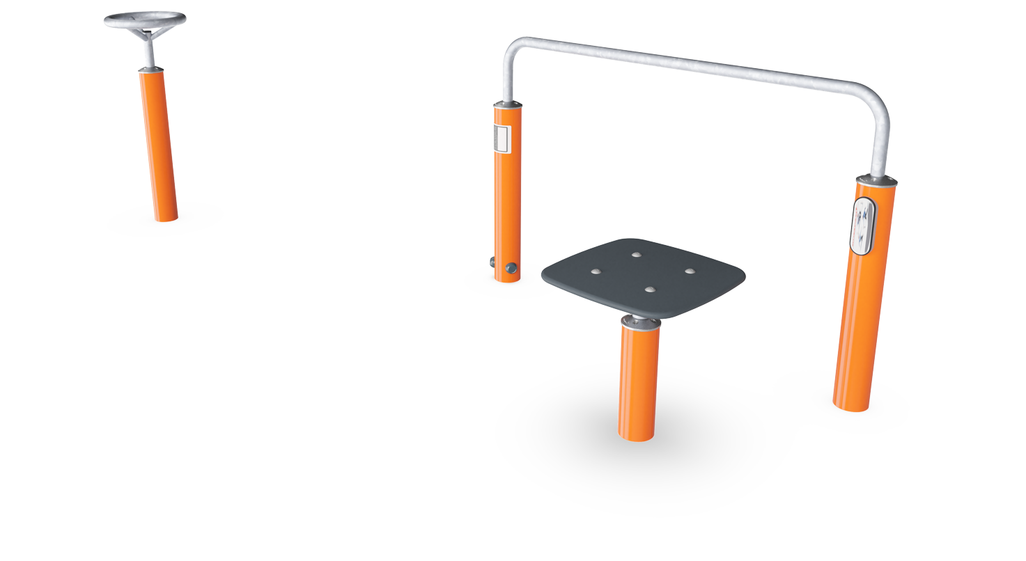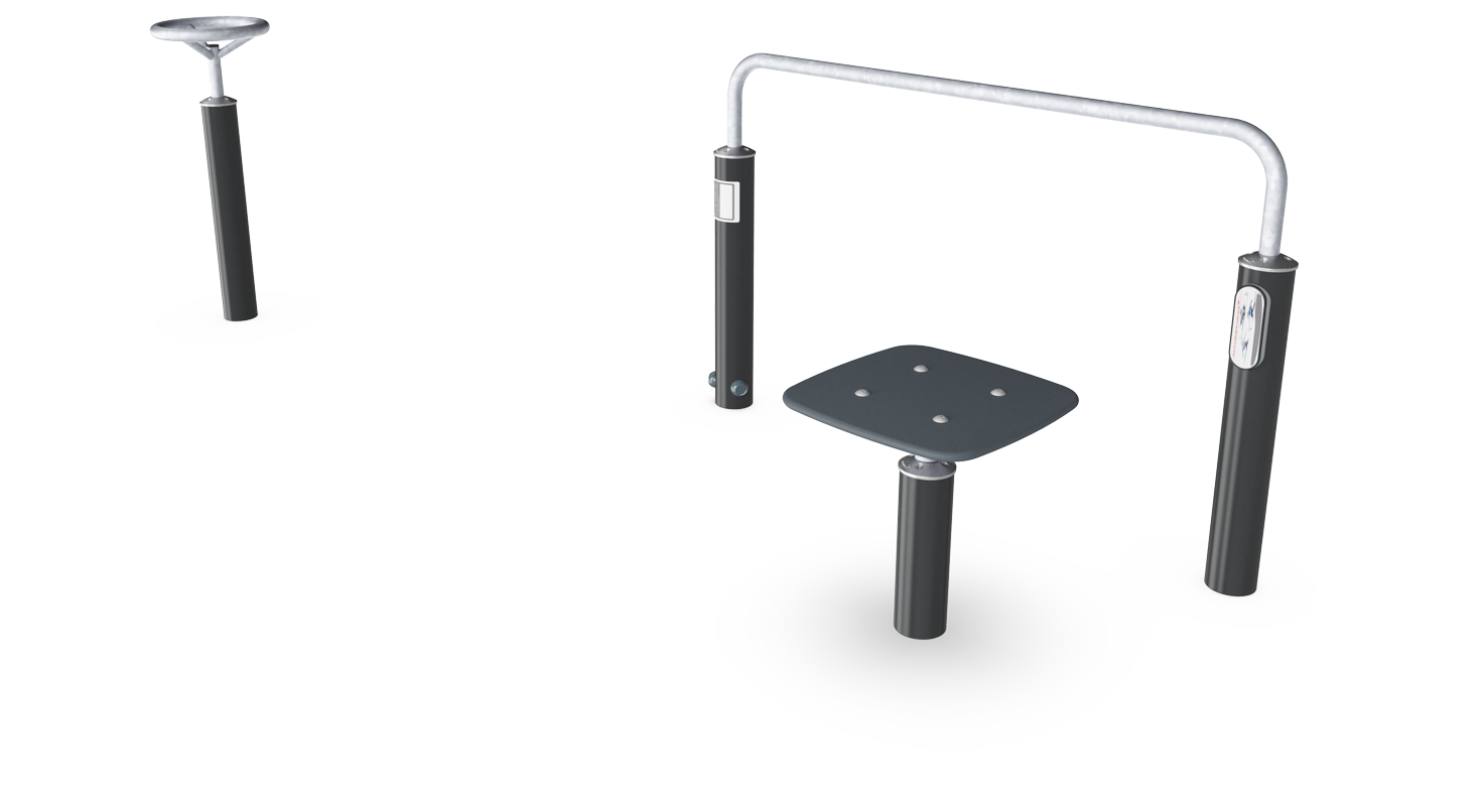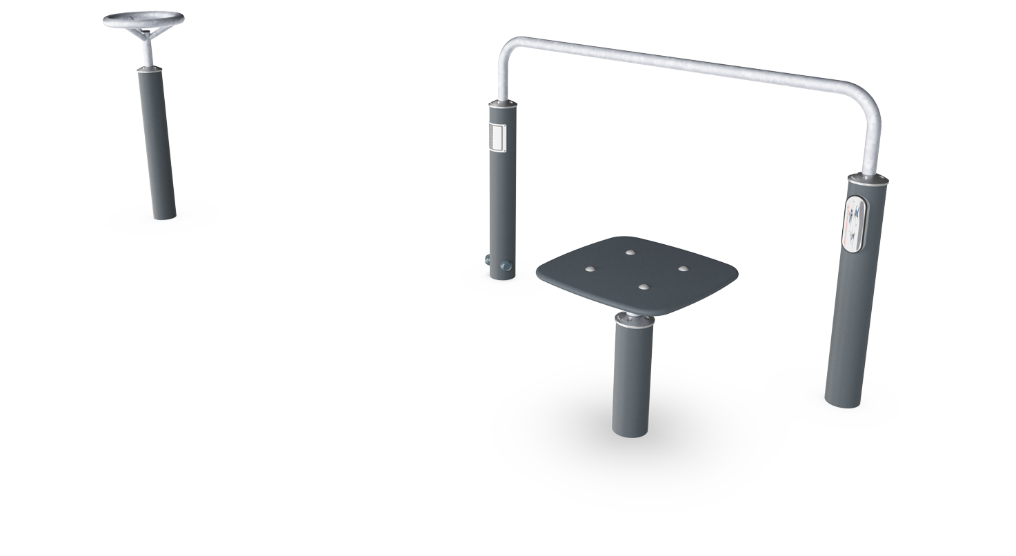 Al evaluar la capacidad funcional de las personas mayores, dos de las pruebas más utilizadas son la prueba Sit & Rise y la prueba Up & Go. Esta instalación está dirigida específicamente a ejecutar estas dos pruebas y capacitarse para mejorar las pruebas. El riel en el medio y la manija redonda en el punto de giro brindan seguridad y soporte adicionales si es necesario. Sit to stand puede ejercitarse desde el asiento con una mano, dos manos o sin apoyo.