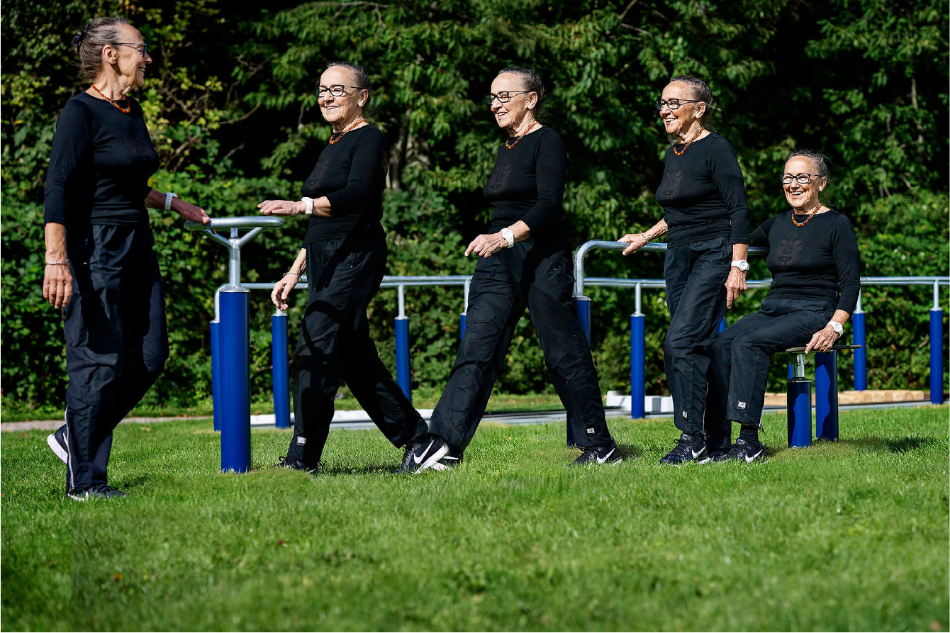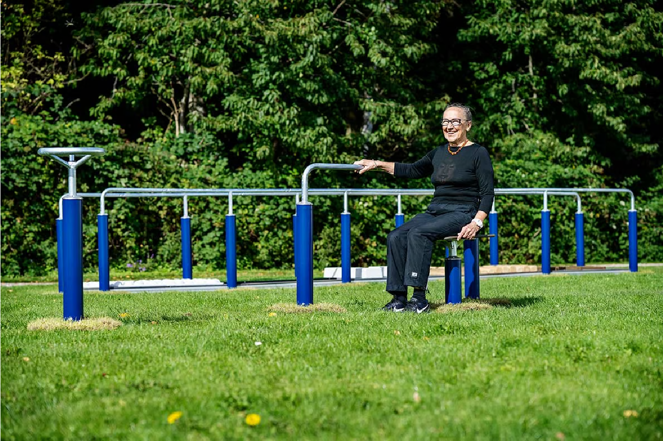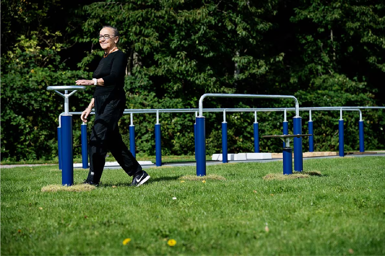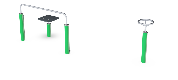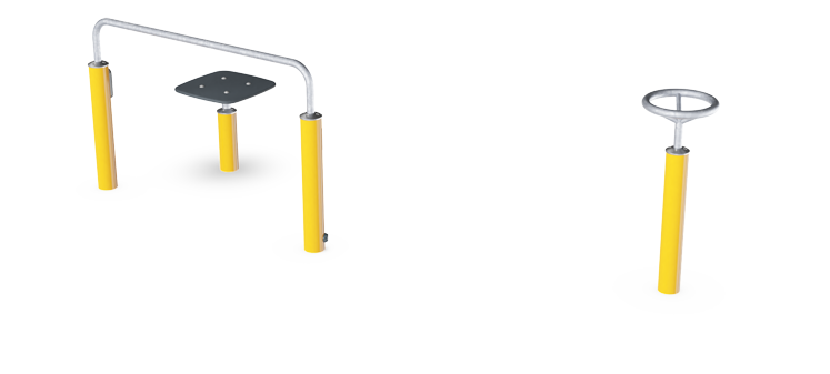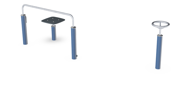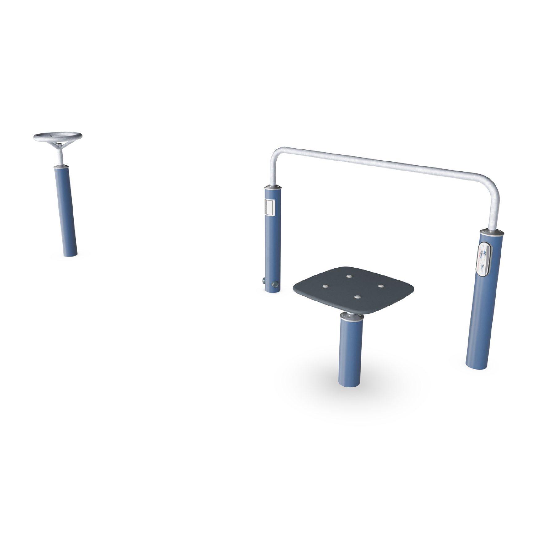 Al evaluar la capacidad funcional de las personas mayores, dos de las pruebas más utilizadas son la prueba Sit & Rise y la prueba Up & Go. Esta instalación está dirigida específicamente a ejecutar estas dos pruebas y capacitarse para mejorar las pruebas. El riel en el medio y la manija redonda en el punto de giro brindan seguridad y soporte adicionales si es necesario. Sit to stand puede ejercitarse desde el asiento con una mano, dos manos o sin apoyo.
