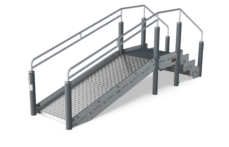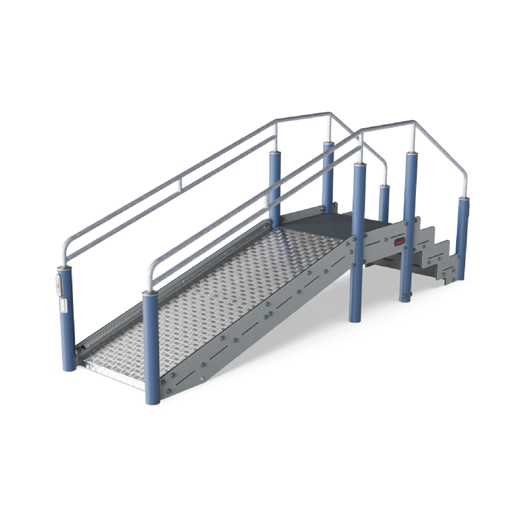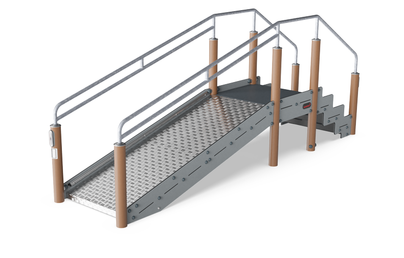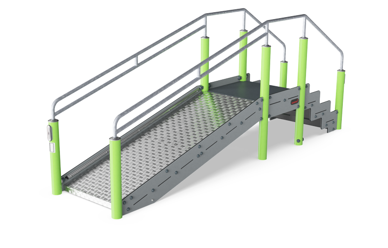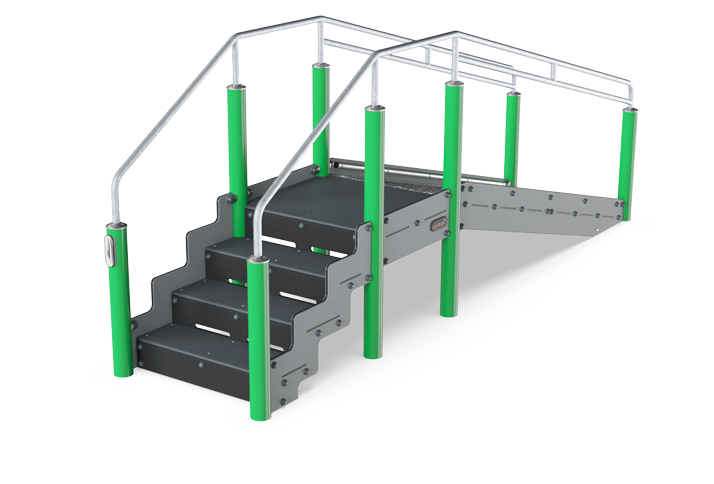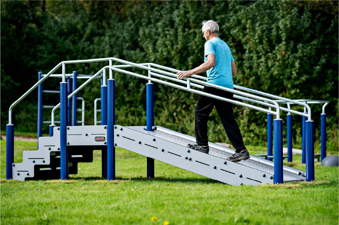 La escalera y la rampa se asemejan a algunos obstáculos cotidianos comunes. Caminar por una pendiente inclinada y superar escaleras. El uso más simple es simplemente caminar de un lado a otro en el módulo, pero con variaciones en la tarea, se pueden entrenar habilidades específicas. Por ejemplo, enfocándose en el equilibrio caminando sin apoyo de la mano o enfocándose en la fuerza y la movilidad usando deliberadamente pasos tan largos como sea posible.