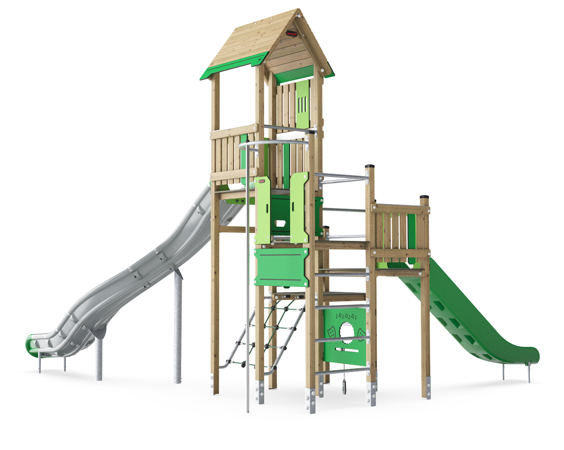 Esta Torre Multideck alta es una estructura de juego intensa y llena de acción que atrae a los niños a trepar, deslizarse y lanzarse. Las distintas formas de acceso y escalada entrenan los músculos y la coordinación cruzada, una habilidad fundamental para la lectoescritura en etapas posteriores. Desde las diferentes plataformas, hay tres formas divertidas de descender al suelo, deslizándose o lanzándose. El poste de bombero entrena intensamente la percepción espacial del niño y añade emoción con su rápida bajada, algo fundamental, por ejemplo, para desarrollar la comprensión de las matemáticas.