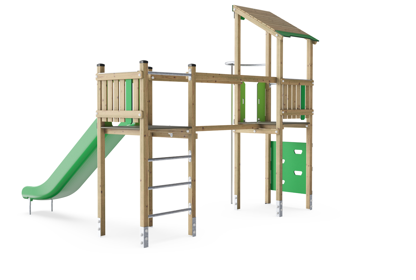 La Torre Doble ofrece una gran variedad de juego que mantiene a los niños jugando durante mucho tiempo. Los puntos de acceso presentan diferentes niveles de dificultad y emoción, al igual que las bajadas: el poste de bombero está pensado para jugadores más experimentados, entrenando la toma de riesgos y la propiocepción. Para los niños que prefieren jugar de manera más segura, la sección del tobogán permite recorridos rápidos, llenos de actividad cardiovascular y equilibrio. El puente invita a un emocionante entrenamiento del equilibrio con amigos, fomentando la cooperación y la consideración hacia los demás, y también entrena el sentido del equilibrio y la percepción del espacio, fundamentales para desenvolverse con seguridad en el mundo.