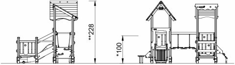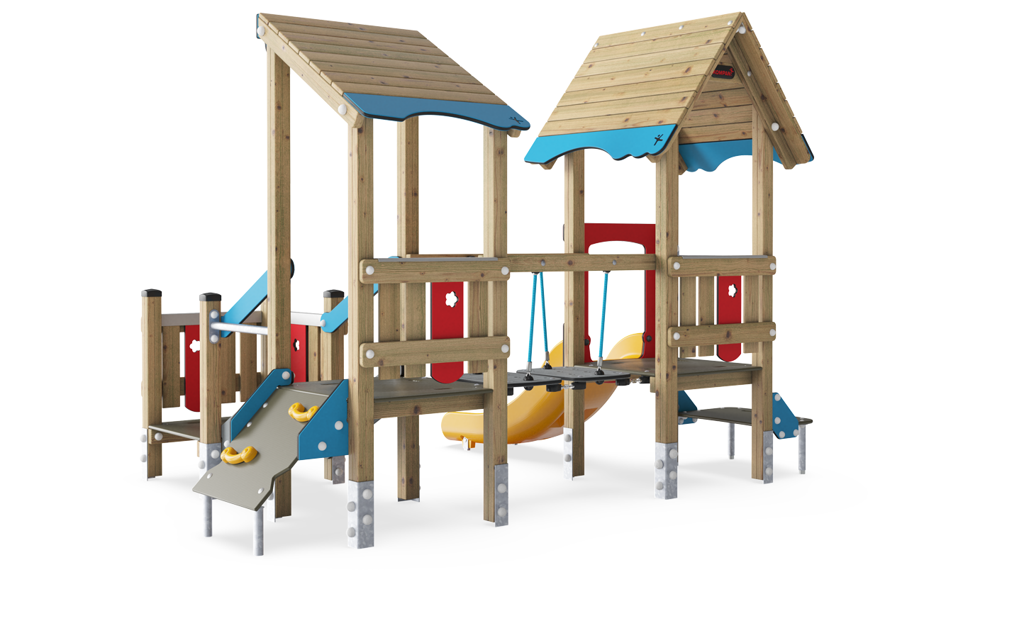 La torre triple con puentes es un espacio de juego magnífico para niños pequeños, que invita tanto al juego físico como social. La combinación de actividades garantiza horas y días de diversión. Los accesos variados y la transparencia de la estructura permiten que todos se beneficien del juego, donde el equilibrio, la coordinación y la percepción espacial son los principales retos físicos: mantener el equilibrio en el puente inclinado y cruzar el puente oscilante es muy divertido y, al mismo tiempo, estimula la percepción del espacio.