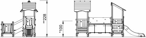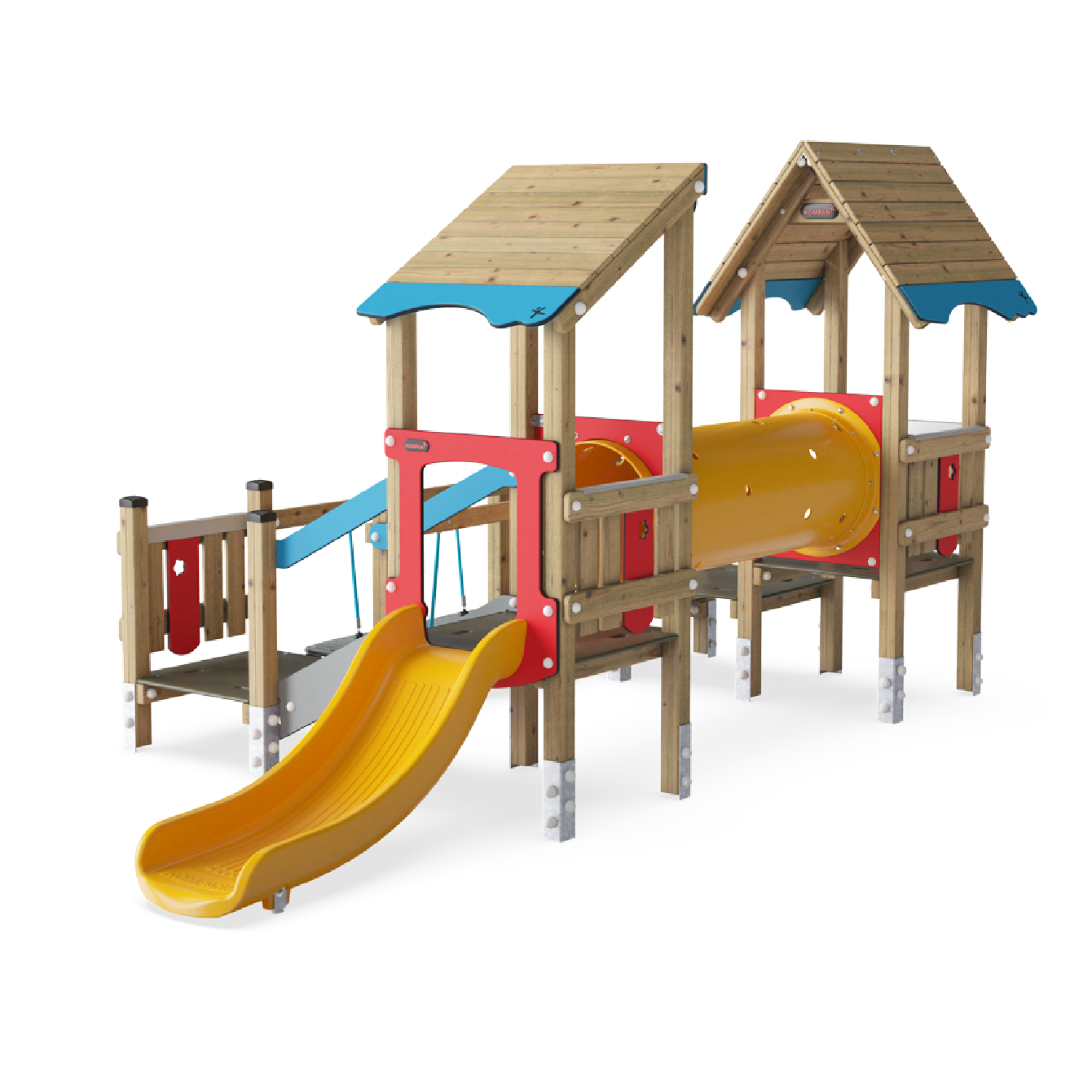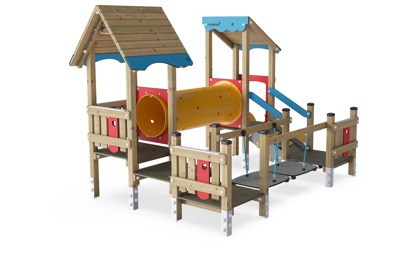 La estructura de cuatro torres con puente oscilante ofrece una gran variedad de experiencias de trepar, gatear y deslizarse. La diversidad de juegos hace que los niños quieran volver una y otra vez. Los distintos puentes ofrecen cada uno su propio desafío, estimulando músculos y habilidades motoras: el puente oscilante entrena el equilibrio, mientras que cada plataforma sirve como punto de descanso o encuentro. El túnel permite deslizarse o gatear, actividades excelentes para la coordinación cruzada, que favorece la cooperación entre los hemisferios derecho e izquierdo del cerebro, necesaria para la lectoescritura futura.