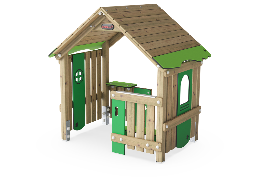 Con su tamaño adaptado a los niños, la casita de juego es un gran incentivo para los más pequeños. Los extremos y paredes abiertos amplían el espacio de juego, permitiendo que muchos niños jueguen desde todos los lados. El escritorio y los bancos ofrecen un excelente punto de encuentro, una y otra vez. El escritorio alto, así como las aberturas hacia el exterior, inspiran el juego dramático clásico, como tiendas y hogares. De esta manera, la casita fomenta y mantiene el juego de roles de los niños.