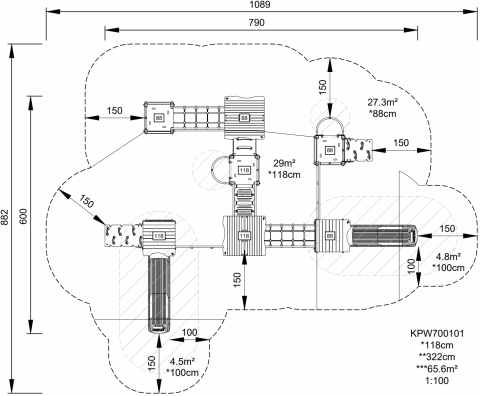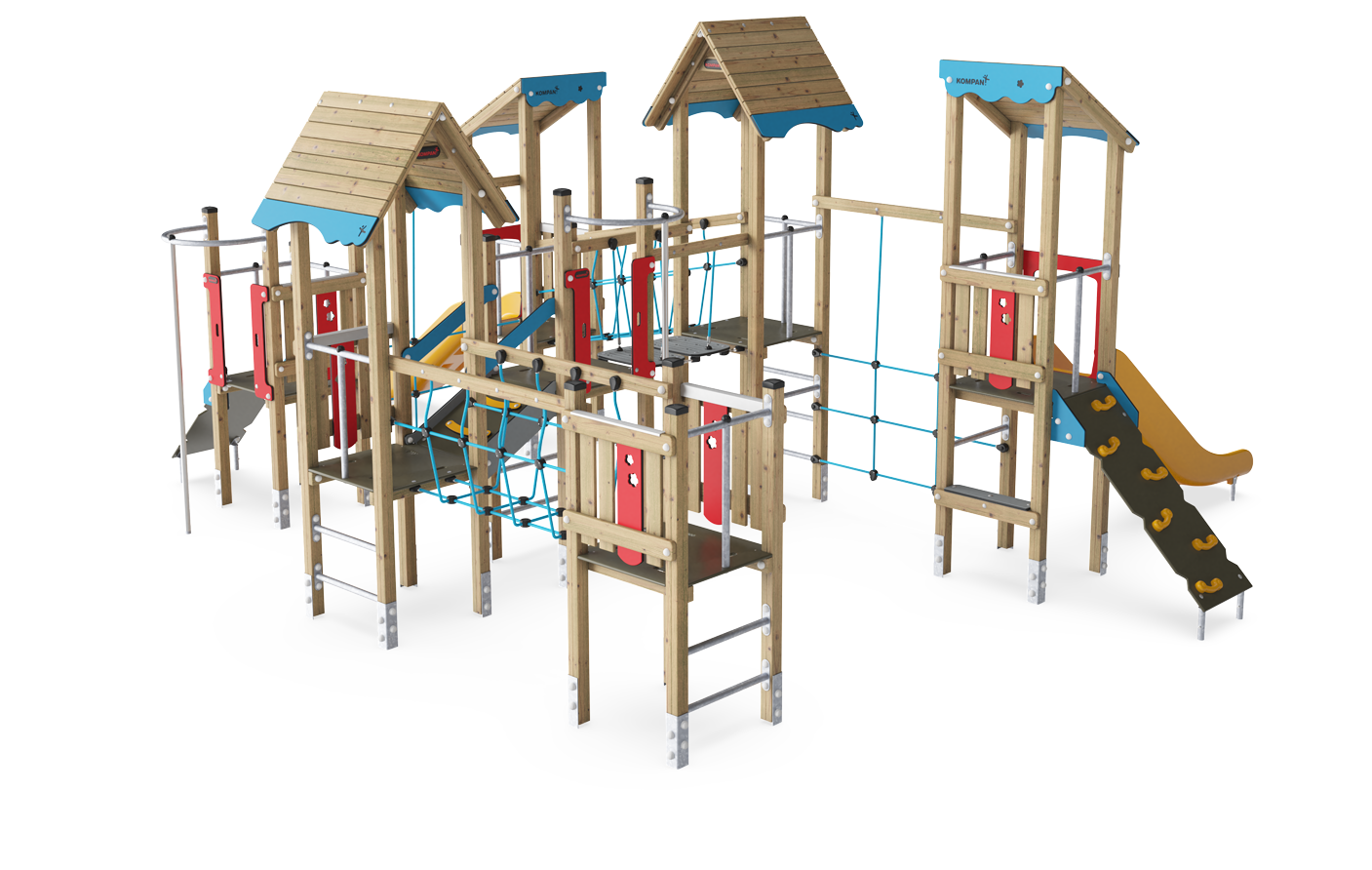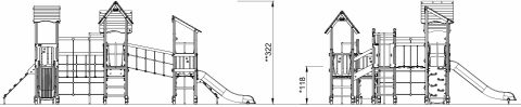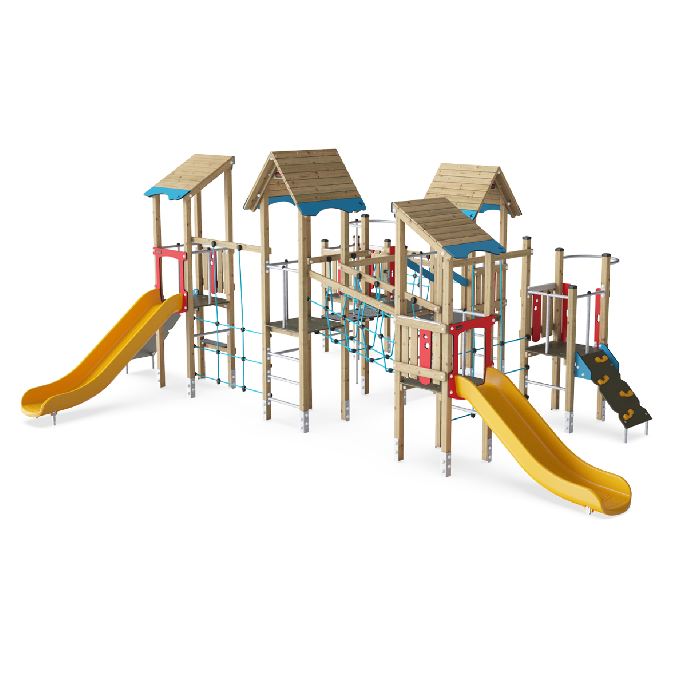 Esta estructura de siete torres ofrece una gran variedad de juego y una alta capacidad para muchos niños, lo que hace que jueguen durante largo tiempo y quieran volver una y otra vez. Las múltiples formas de subir a las plataformas, mediante distintas escaleras y paredes de escalada, hacen que la exploración sea divertida y a la vez entrenen la coordinación cruzada y los músculos del niño.