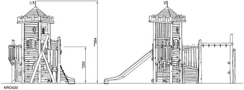 El castillo le da a cualquier parque infantil un toque real. Es una gran arquitectura para jóvenes príncipes, princesas, reyes y reinas. Y los atraerá una y otra vez. El castillo permite que una variedad de edades jueguen juntas e invita a toda la familia a un día de juego real. Con su terreno y guaridas de niveles elevados, ventanas con barrotes y cañones, el castillo invita a un juego de rol. Esto estimula el desarrollo del lenguaje y las habilidades sociales de los niños. Los variados accesos, barras y paredes de escalada entrenan habilidades musculares y coordinación cruzada. Las barras de mono son fantásticas para la parte superior del cuerpo y los músculos centrales. Estos son importantes para entrenar a los niños sedentarios de hoy.