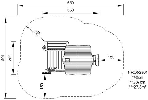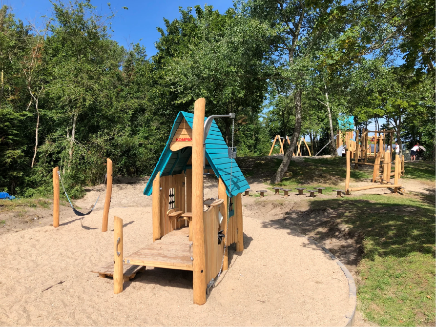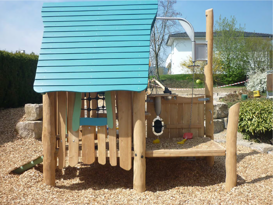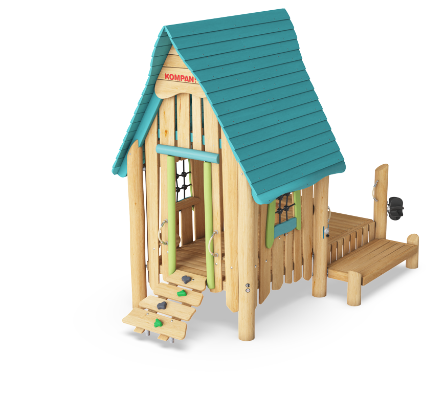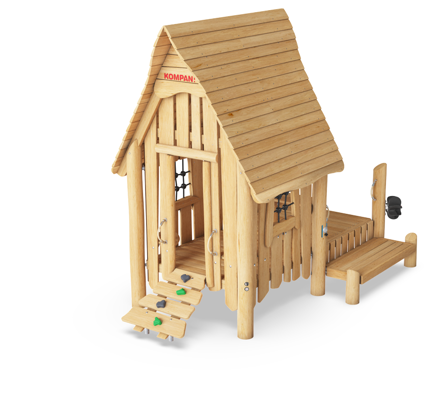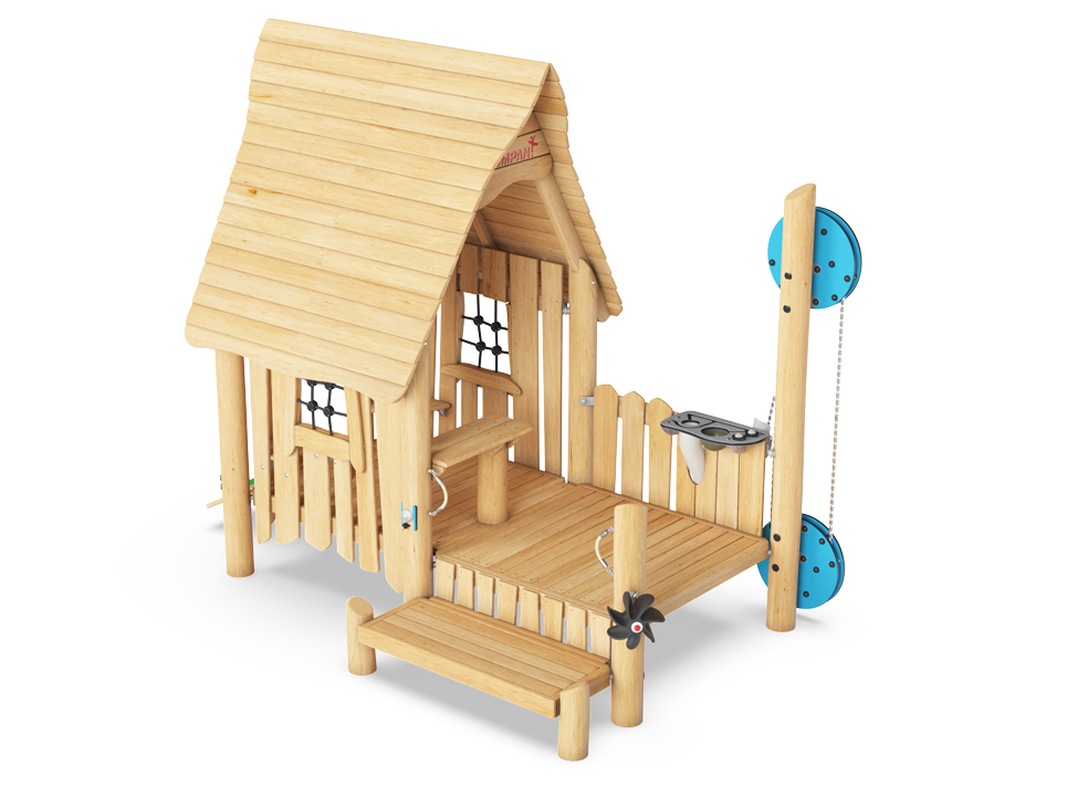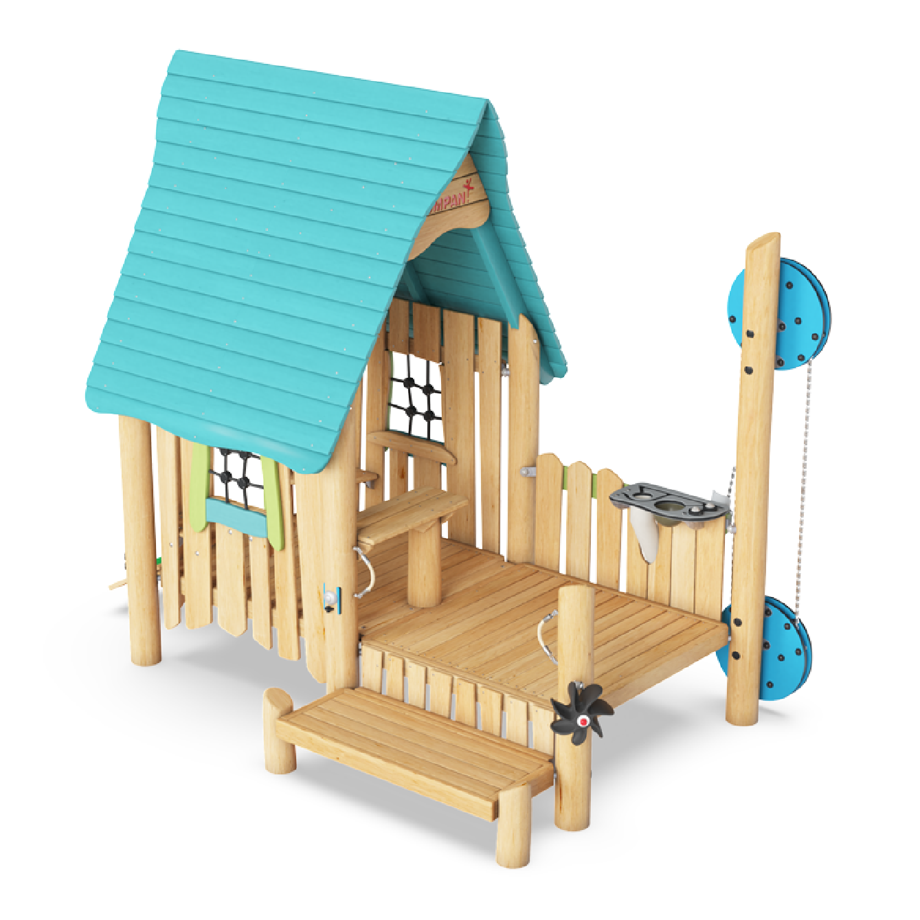 La casita con banco y escritorio invita al juego simbólico, y su plataforma abierta permite que todos los niños puedan participar y jugar sin barreras.