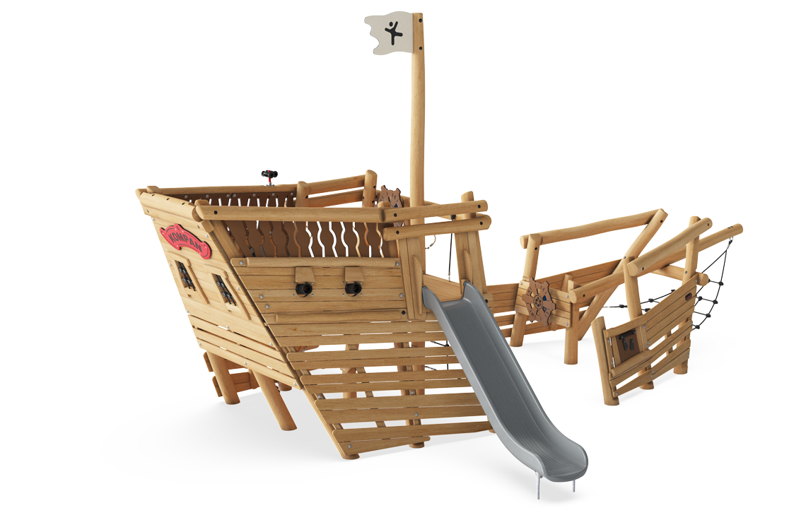 El barco pirata es un auténtico imán para el juego infantil, atrayendo a los niños una y otra vez gracias a su gran variedad de actividades, tanto en la cubierta como debajo de ella. Subir al barco es toda una aventura, con infinitas opciones como tablas verticales, redes para trepar y cornamusas que desafían la coordinación y fortalecen los músculos. Los niños se sienten fascinados por las múltiples características interactivas: binoculares, cañones y el timón del barco, que estimulan la exploración táctil y las habilidades motoras finas, a la vez que fomentan horas de juego imaginativo y dramático.
