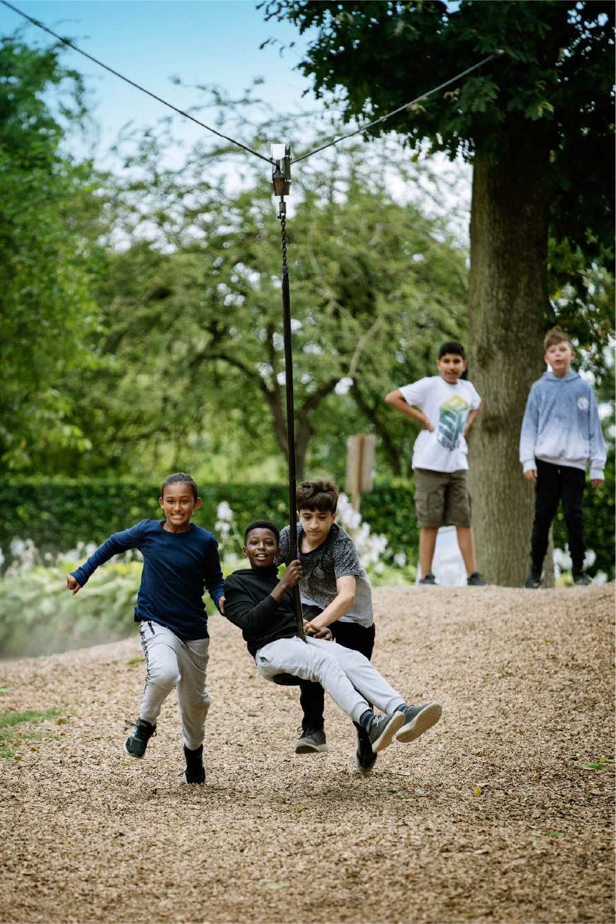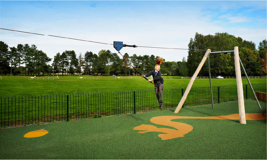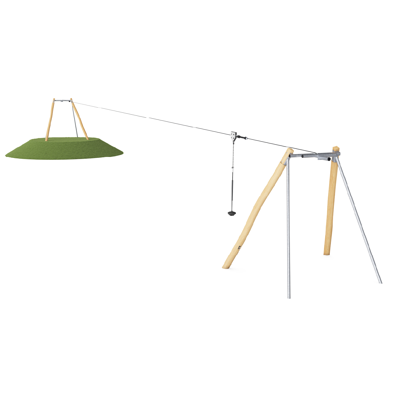 A los niños les encanta jugar en la gran Tirolina. Cualquiera puede jugar en la tirolina gracias a su longitud y a su asiento y asidero de apoyo. La emoción de deslizarse por el aire hace que los niños quieran jugar en la tirolina una y otra vez. La sensación de ligereza y el impulso en el aire ayudan a desarrollar la conciencia espacial, así como la comprensión de la gravedad, el espacio y la velocidad. Las habilidades sociales se entrenan a medida que los niños devuelven el asiento al siguiente usuario de la fila. Además, al correr y tirar, el niño entrena su capacidad cardiovascular y los músculos de la parte superior del cuerpo.