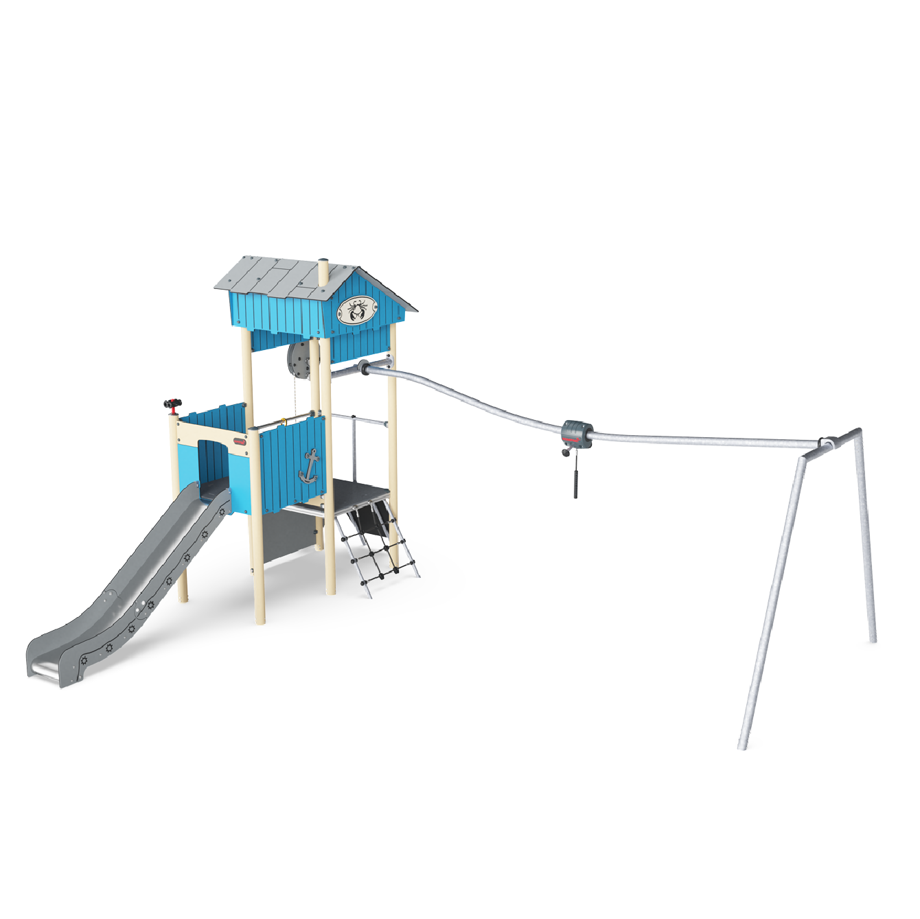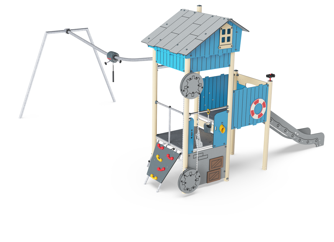 La fabulosa Lonja de pescado con tirolina es la riqueza de opciones de juego divertidas que los niños sueñan con volver a visitar una y otra vez. A nivel del suelo, un increíble panel de juego con ruedas giratorias que emiten sonidos variados invita a la exploración e inspira el juego dramático. La correspondencia con el elevador de arena que va hacia la plataforma amplía la invitación al juego y motiva la actividad física cuando los niños suben y bajan por la estructura de juego, entrenando su coordinación cruzada y músculos, lo que desarrolla habilidades motrices y musculares que les ayudarán a navegar por el mundo con confianza.