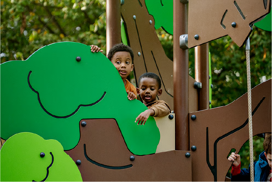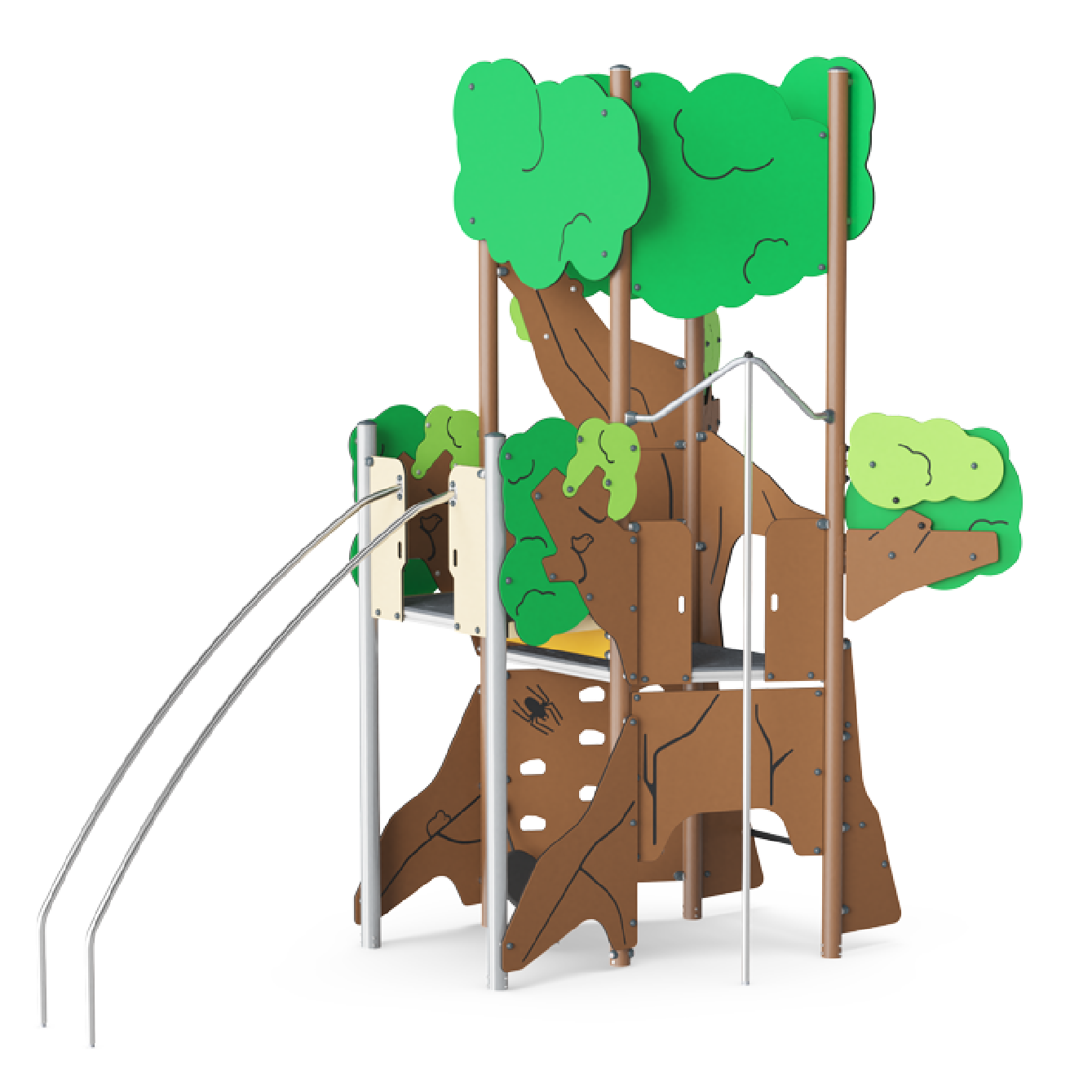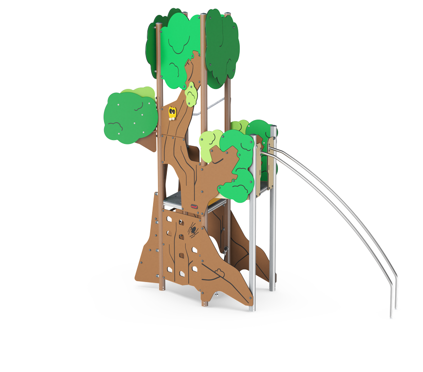 Este hermoso árbol para escalar intriga a los niños y los invita a jugar una y otra vez. Escalar es una de las actividades favoritas de los niños. En el Árbol Mirador, las opciones de escalada densas pero variadas llevan a los niños hacia arriba, abajo y alrededor del árbol. Desde la plataforma superior, los niños pueden disfrutar de la vista del parque infantil y regresar al suelo a través de las barras del pasamanos. Además de ser muy divertido, escalar entrena la coordinación cruzada y los grupos musculares principales de los niños.
