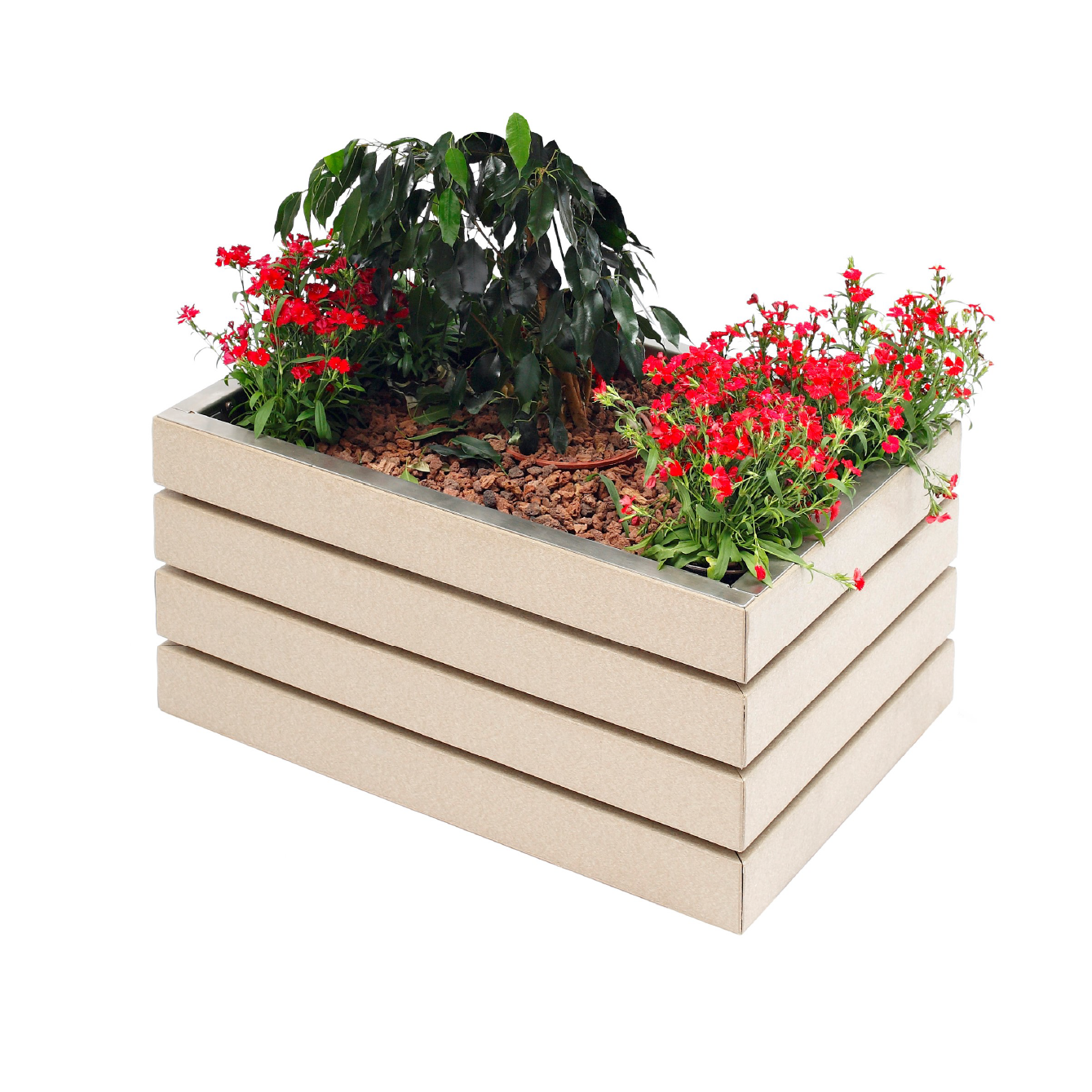 Elemento de mobiliario urbano para los mas ecológicos, no solo por las plantas que pueden colocarse en el, si no también por estar fabricado con plástico reciclado que es un material de gran durabilidad y que evita la tala de arboles para su fabricación.