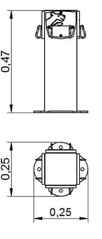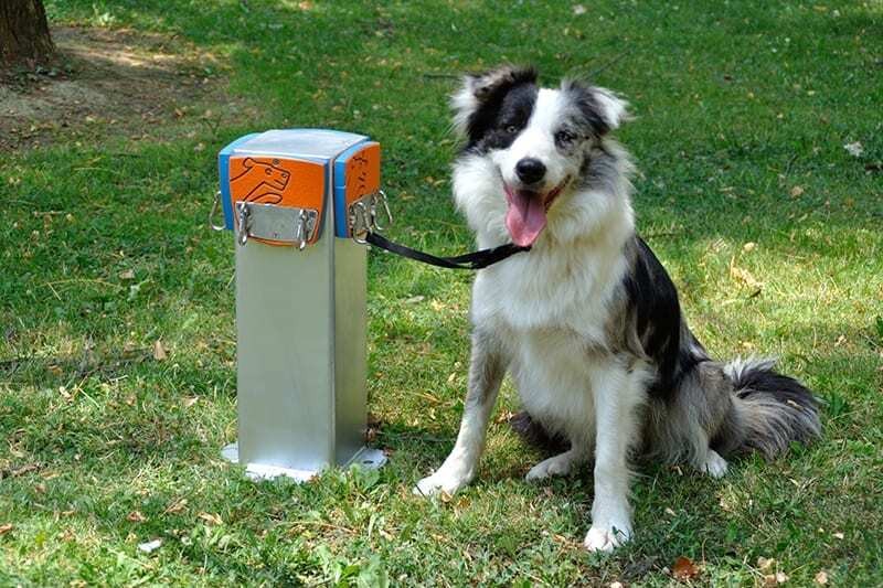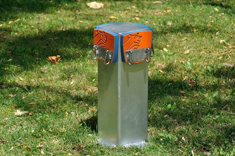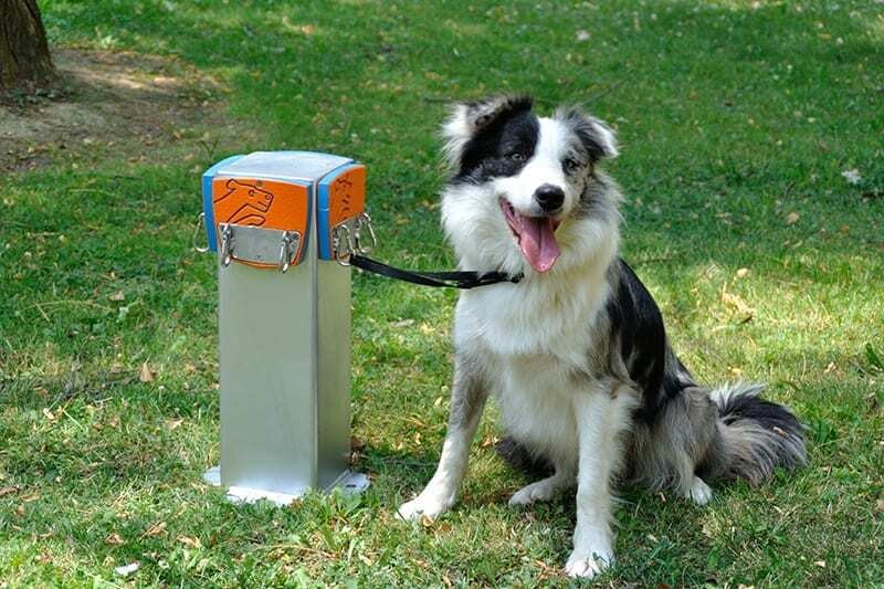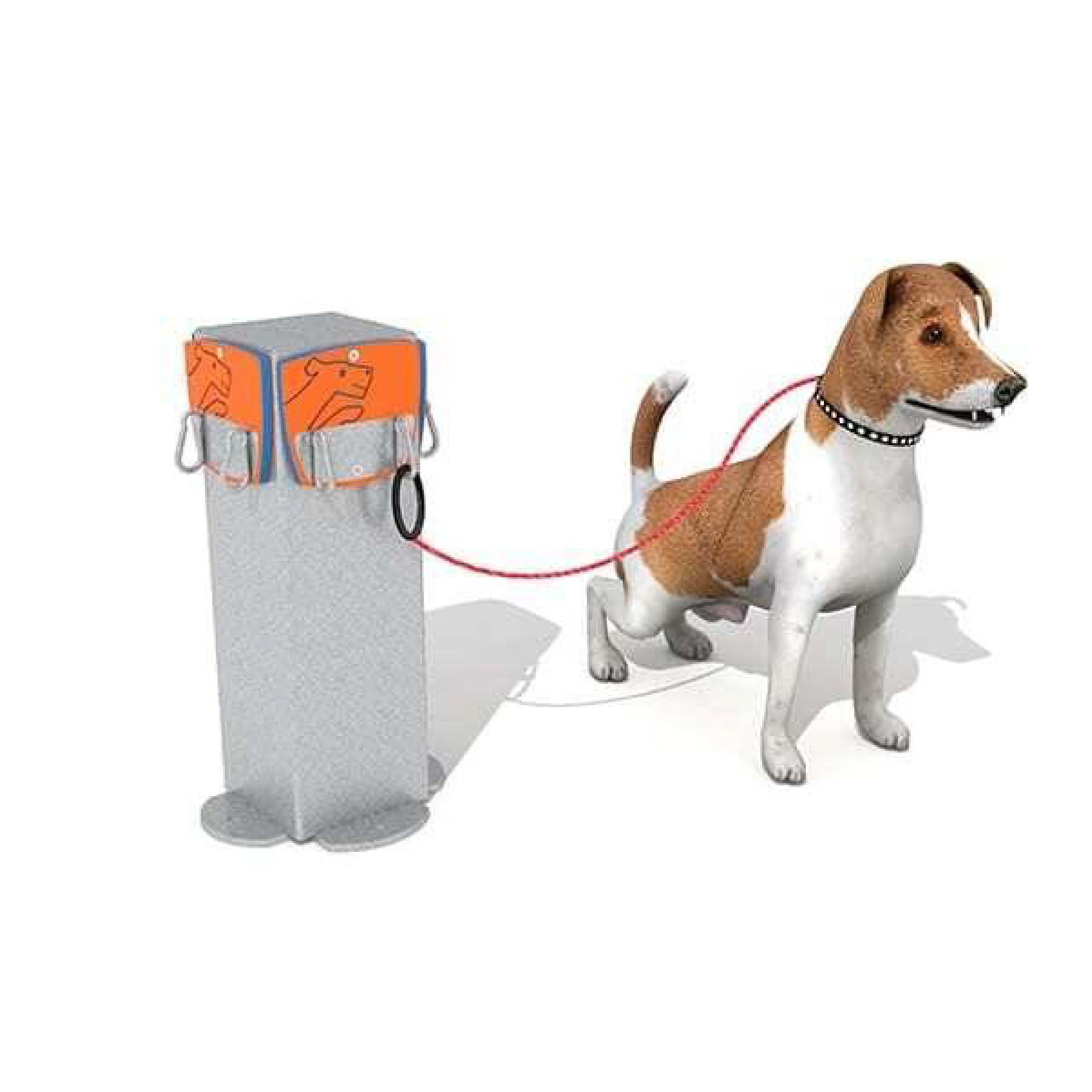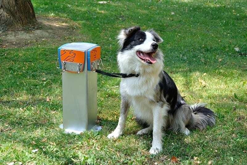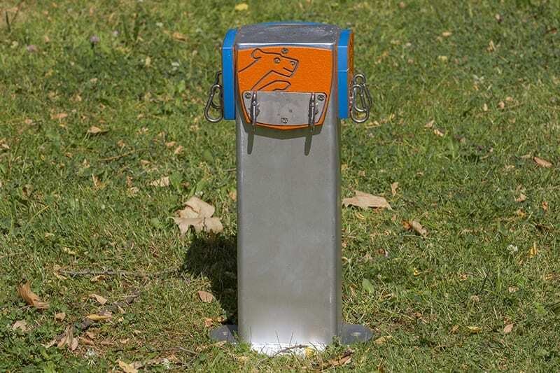 Guardacanes. Poste con sistema de seguridad de fácil amarre con enganches para la correa que evitan la huída del perro. Ocho plazas.