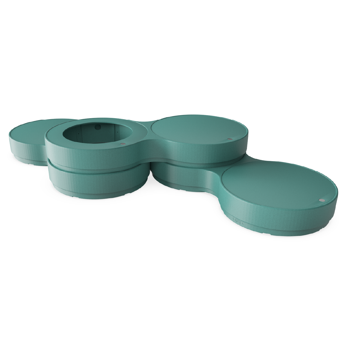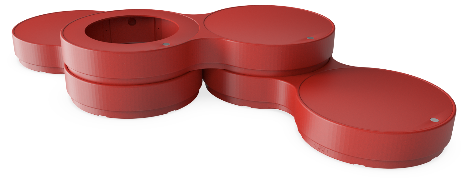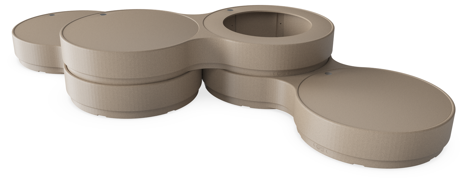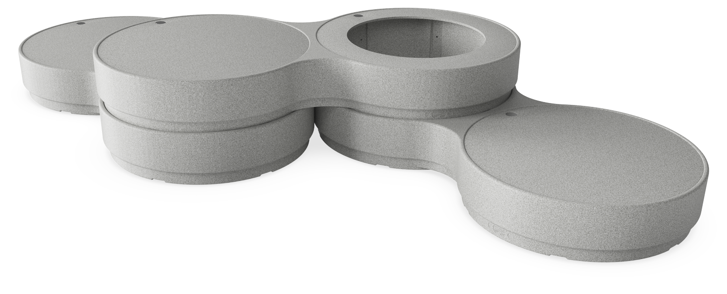 Circus Quadro está compuesto por cuatro módulos circulares interconectados en dos alturas, una al nivel de un banco convencional y otra más baja. Esta variación de alturas genera un ritmo visual e invita a diferentes formas de uso, desde el asiento clásico hasta pausas informales. Su forma abierta funciona tanto como punto de encuentro como divisor sutil, permitiendo una fácil adaptación del mobiliario a la geometría y el flujo del espacio. Uno de los módulos puede incorporar vegetación, integrando el verde directamente en el mobiliario, desde plantaciones bajas y divisores espaciales hasta pequeños árboles. Esto convierte a Quadro en una contribución activa a la estructura verde, mejorando tanto la biodiversidad como la experiencia recreativa.